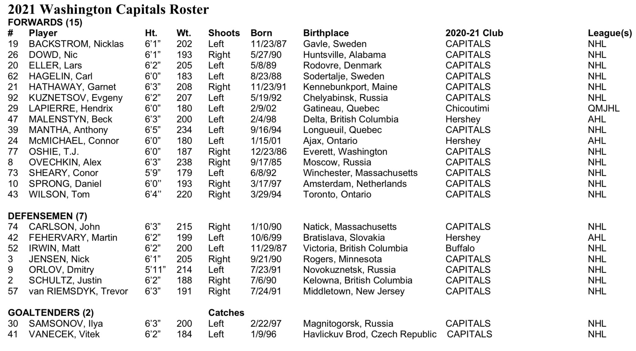 Pheonix Copley (goalie). The Caps are not deep at the most important position on the ice and are depending on a pair of youngsters with a combined 82 games of regular season experience heading into the season. Pheonix Copley has experience, but only 29 games worth over three seasons, 27 of them with the Caps in 2018-2019 (24-16-7, 2.90, .905, one shutout). That 2018-2019 action was his last in the NHL to date. He has been fair in his most recent two seasons in Hershey, going 27-12-7, 2.53, .902, with four shutouts. But Copley has one season as a backup, one which he put up good back-up numbers for a very good team. Can he fill in as an emergency call-up if either Ilya Samsonov or Vitek Vanecek falter? Remember, the Caps’ number three goalie last season ended up leading the team with 37 appearances. Copley is not likely to come close to that this season, but he could end up getting 5-10 appearances.